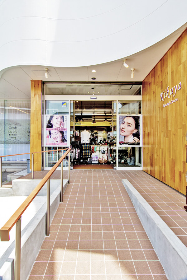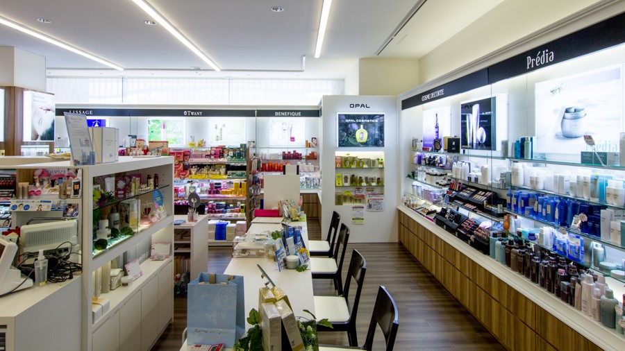 化粧品と雑貨のスペースを分離しつつ、家族で一緒に来店するお店づくりを目指した全面改装。